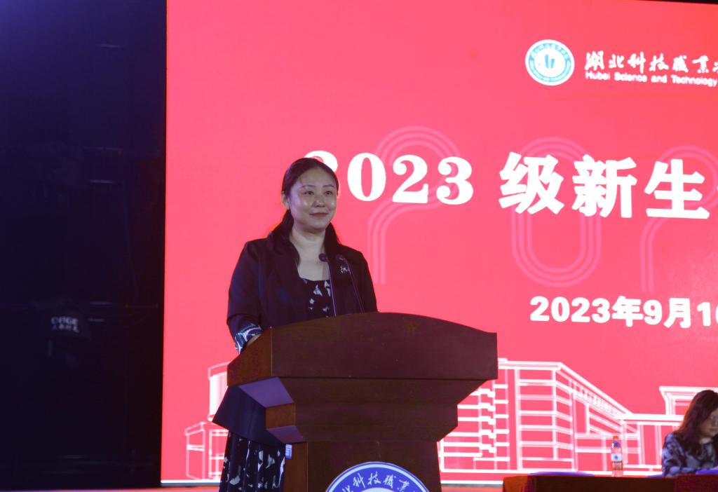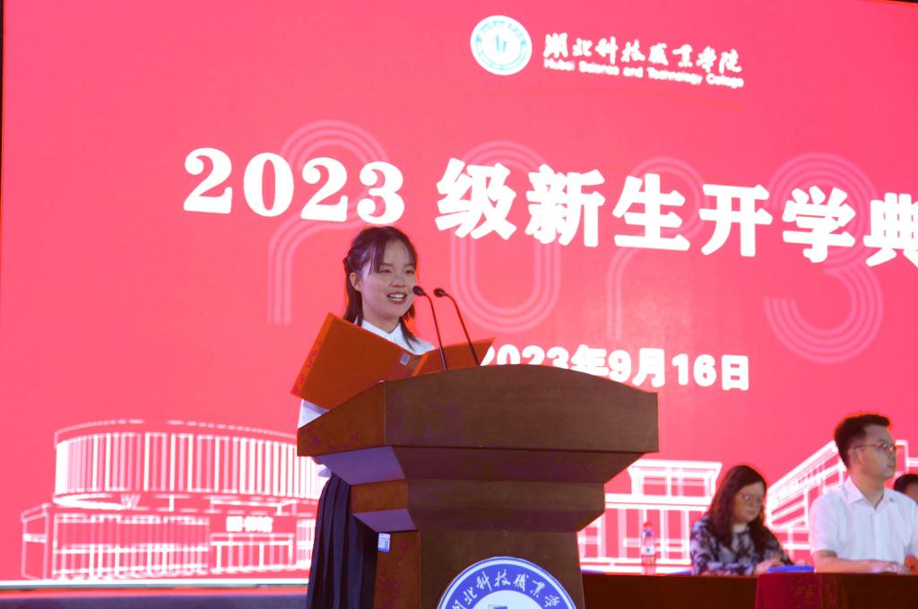 新生代表经济贸易学院2023级金融科技应用专业王鑫雨同学发言。她用三句话明确了自己大学三年的奋斗方向:树立远大目标,坚定理想信念,学好专业技能。她坚信在湖科一定会成就更好的自己。