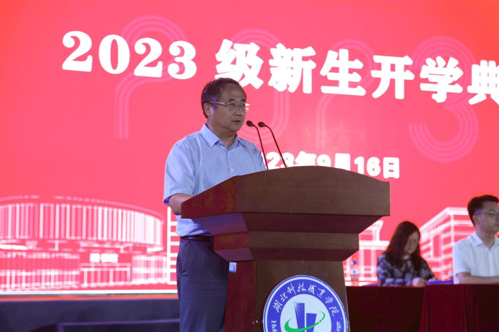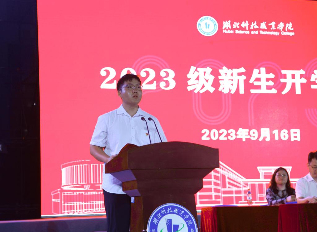 在校生代表机电工程学院2021级工业机器人专业杨文凯同学发言。他跟大家分享了自己入学两年来的思想进步与个人成长,给予学弟学妹们有益的启发借鉴,期待学弟学妹们在湖科校园勤而行之、日有所进,成长为全面发展的时代新人,在青春的赛道上跑出当代青年最好的成绩。