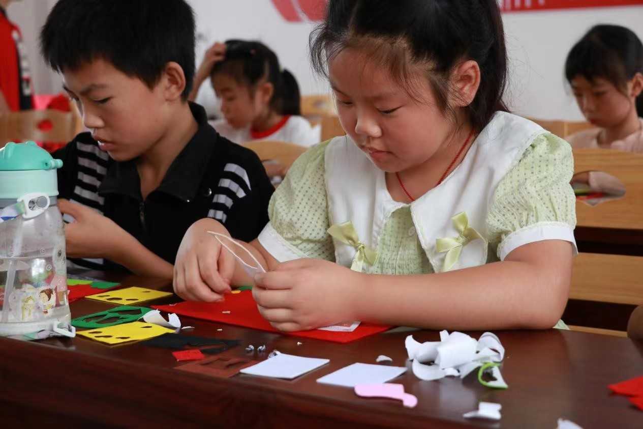图为头雁实践队成员教小朋友们制作不织布画-我爱我的祖国