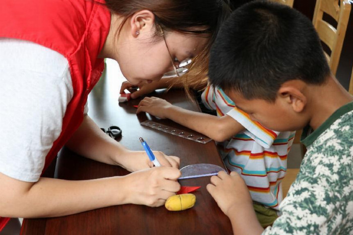 (图为头雁实践队成员帮助小朋友们制作衍纸小动物)