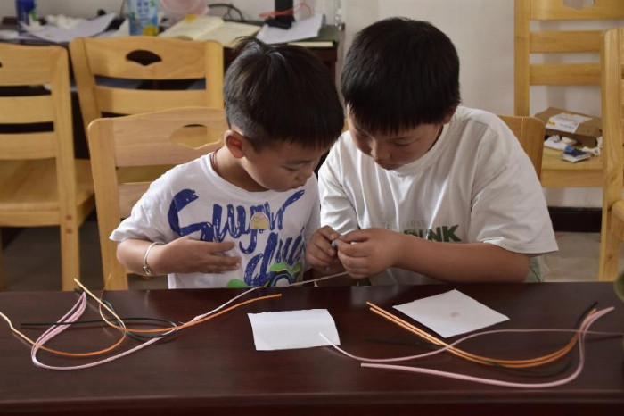 (图为小朋友们互帮互助一起制作衍纸小动物)