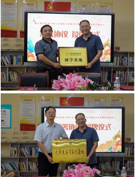 签约仪式上,双方签署校校合作协议,云博电子体育授予江夏区大花岭小学“大学生实习实训基地”,大花岭小学授予该校“研学基地”。