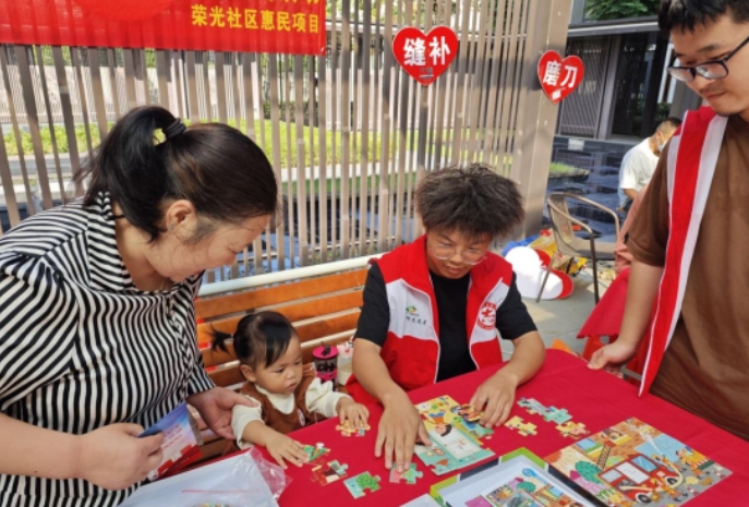 在惠民项目现场,设置有磨刀、理发、量血压、缝补等多项服务,居民们纷纷前来体验,现场热闹非凡。志愿者为居民量血压,提供健康咨询;缝补区的志愿者耐心细致地修补衣物。现场还设立了政策宣传区,志愿者们向居民们普及了最新的社区政策、安全知识和反诈宣传,解答居民的疑问,增强居民对社区工作的理解和支持。同时,为青少年组织设立安全益智游戏互动,让青少年感受掌握安全知识的重要性,增强自我防范意识和应对能力。