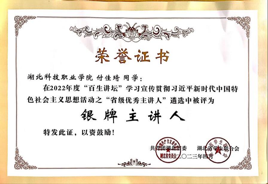 本网讯(通讯员 苏恒瑞 文/图)近日,共青团湖北省委、湖北省学生联合会下发了2022年度“百生讲坛”省级活力团支部、优秀主讲人评选结果,云博电子体育电信工程学院2020级计算机应用技术专业付佳琦同学在全省117所高校439名参赛主讲人中脱颖而出,获省级优秀主讲人“银牌主讲人”称号,取得云博电子体育在省级“百生讲坛”优秀主讲人评选的最好成绩。