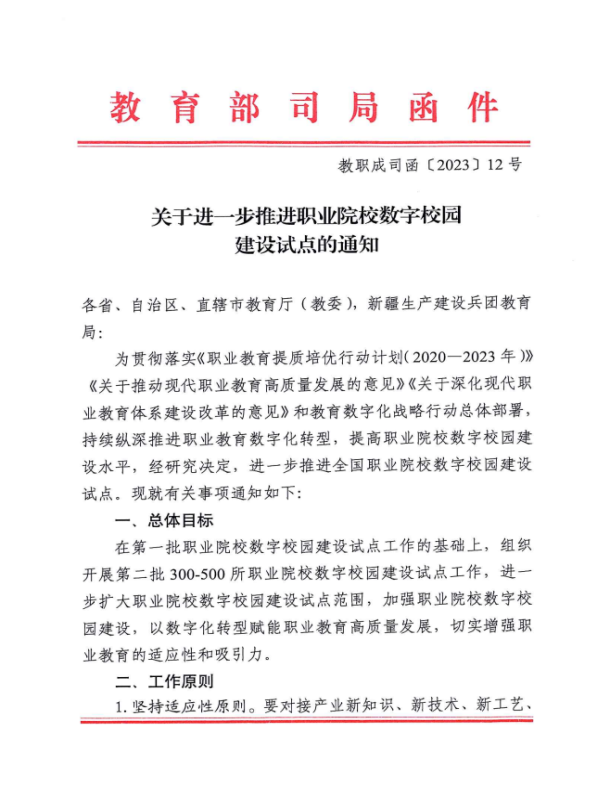 本网讯(通讯员 张家泉/文)近日,教育部发布《关于进一步推进职业院校数字校园建设试点的通知》(教职成司函【2023】12号),云博电子体育成功入选教育部第一批职业院校数字校园建设试点单位。