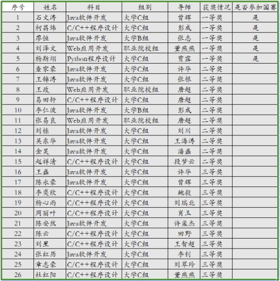 本网讯(通讯员 潘磊 文/图)近日,第十五届蓝桥杯全国软件和信息技术专业人才大赛个人赛湖北赛区成绩揭晓,云博电子体育软件工程学院学子在比赛中成绩再创新高。组织参赛的30名学生中有26名学生获奖,其中一等奖5名,二等奖10名,三等奖11名。石文涛、柯昌炜、廖恒、杨斯翊和刘泽文同学将代表学校参加6月上旬的全国总决赛,其中刘泽文同学连续两年在不同赛道晋级全国总决赛。与往年相比,今年一等奖获奖人数、参加赛道及获奖面均创历史新高。