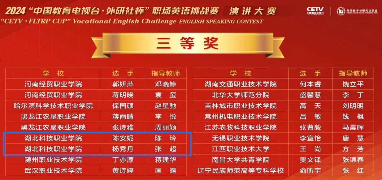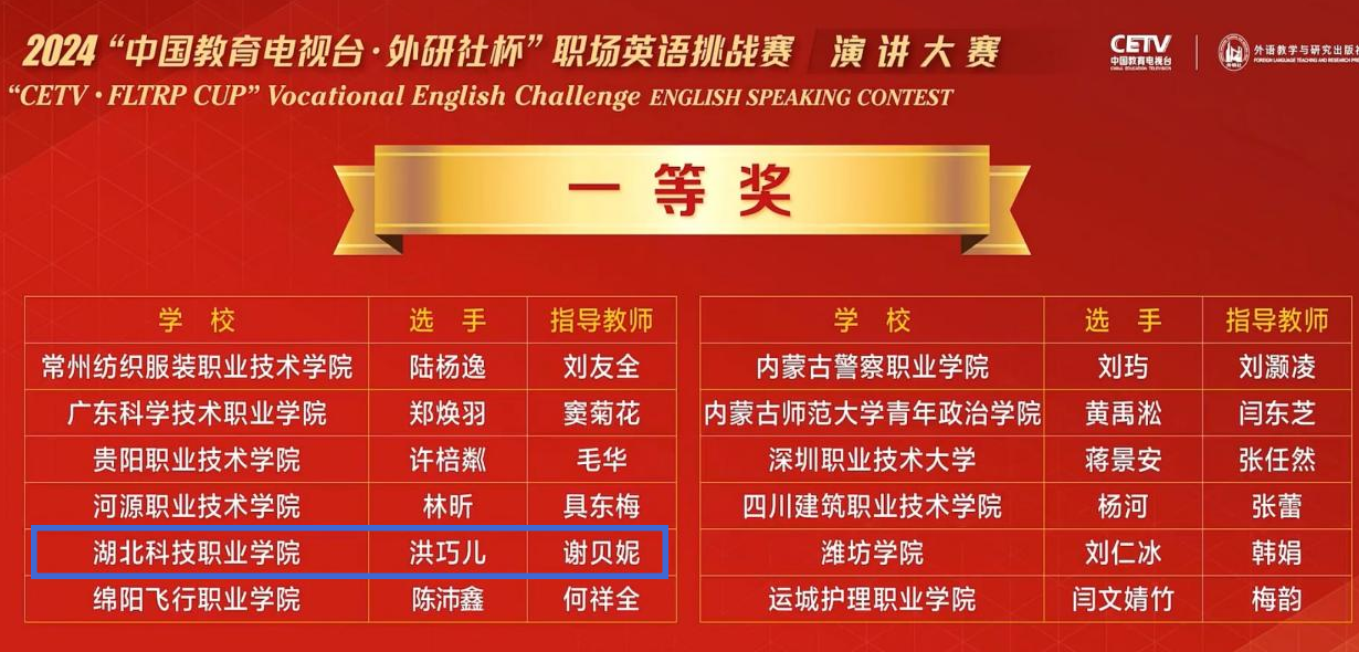 本次大赛从5月开始启动,历经校赛、省赛、全国网络赛和全国总决赛的层层选拔。在过去的半年中,云博电子体育英语教学团队不断升级备赛模式,优化赛事指导方案,力求全方位提升学生的竞争力。洪巧儿在省赛中以总分第三的骄人成绩代表湖北省出征全国决赛,陈安妮和杨秀丹以网络赛场特等奖的优异成绩晋级全国决赛。云博电子体育首次获得本项赛事的国赛资格,并一举获取3名全国决赛晋级名额,在全国兄弟院校实为罕见,不仅创下了湖北省参赛院校单次晋级国赛的最高纪录,也成为与深圳职业技术大学、浙江交通职业技术学院并居全国决赛名额之首的三所院校,为学校在全国范围内赢得了广泛关注和高度美誉。
