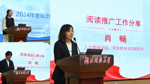 在阅读分享环节,人文管理学院、开放教育学院副院长肖畅以终身学习读书社为例,分享了学院在成人继续教育领域的阅读推广工作。第九届湖北省高职高专院校“共享全民阅读”活动二等奖获奖者、机电工程学院刘根同学分享了比赛心得与阅读感悟。