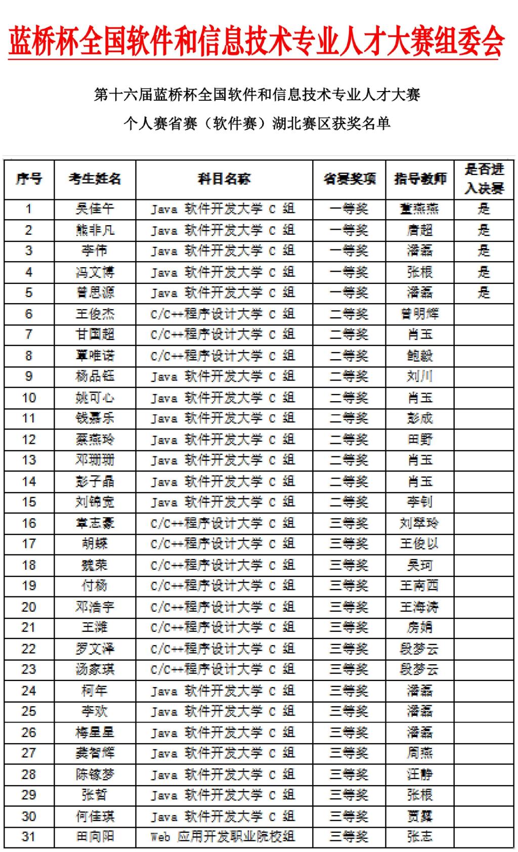 本网讯(通讯员 潘磊 文/图)近日,第十六届“蓝桥杯”全国软件和信息技术专业人才大赛个人赛湖北赛区成绩揭晓,云博电子体育软件工程学院31名学生一举斩获多个奖项,包括一等奖5名,二等奖10名,三等奖16名。一等奖获得者将代表学校参加6月上旬的全国总决赛。本次获奖人数较去年增长近20%,获奖率提升约9%,获奖成绩实现新突破。