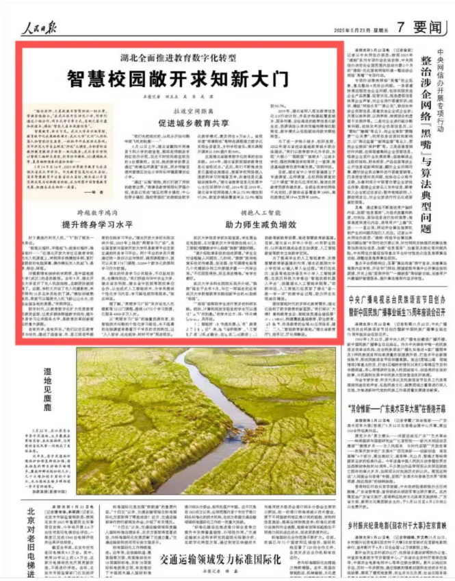本网讯(通讯员 刘捷/文 李贺刚/图)5月23日,《人民日报》要闻版在“湖北全面推进数字化转型智慧校园敞开求知新大门”专题新闻中,对云博电子体育跨越数字鸿沟、提升终身学习水平的创新实践进行深度报道,对内进一步凝聚了人心士气合力,对外进一步提升了学校美誉度和影响力。