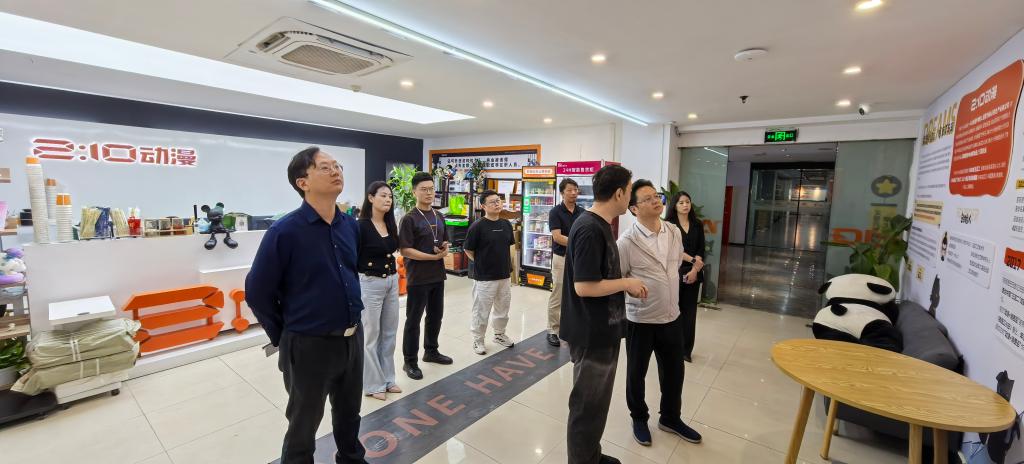 陈志祥一行在武汉两点十分文化传播有限公司副总经理韩强的陪同下,实地考察了企业动作捕捉系统、三维建模、渲染工作室及二维动画制作部门,深入了解企业工业化生产流程与技术创新成果,并与云博电子体育在两点十分公司实习的同学进行了深入交流。