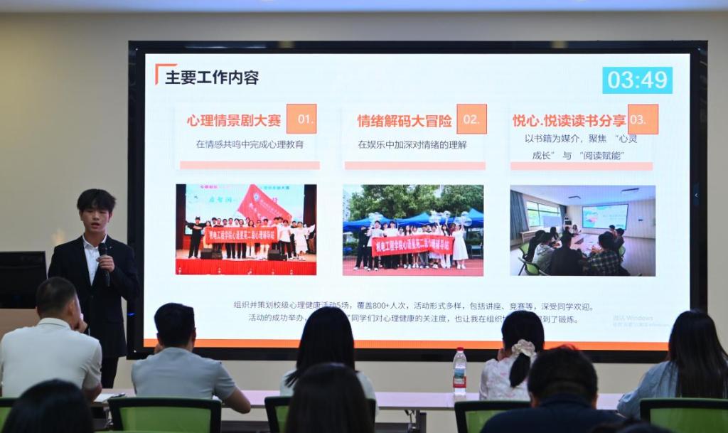 3月至5月,学工部开展心理情景剧编创、心理委员专项培训,各学院通过素质拓展、心理观影等活动提升队伍能力。5月25日,机电工程学院承办“关爱心灵 共筑未来”心理委员PPT大赛,12名选手围绕“履职实践、案例干预、未来规划”分享经验,以数据化成果、可视化案例聚焦工作实际,展现了心理委员在“宿舍—班级—学院—学校”四级预警体系中“前沿哨兵”的作用。
