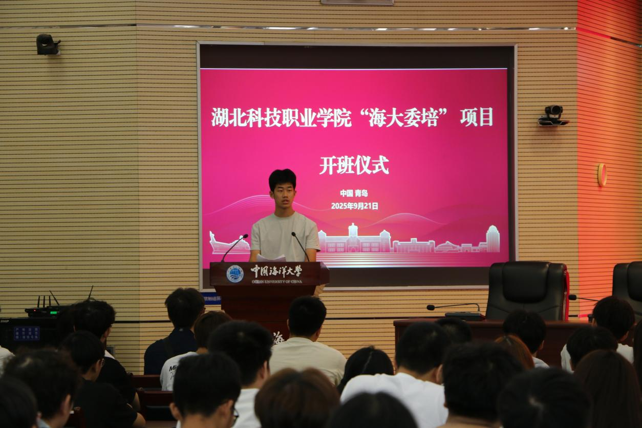 2025 级电气自动化技术专业学生雷展鹏作为新生代表发言。他诚挚感谢两校领导与老师搭建的受教平台,分享了报到时的温暖氛围与入学教育的充实收获并表示,将以“湖科人”“海大人”双重身份为标识,与同学们相互鼓励、共同进步,不负期待。