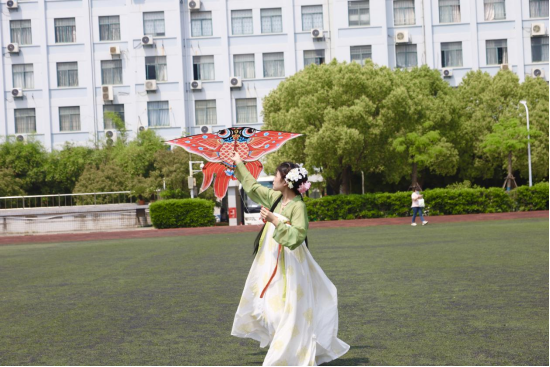 一根风筝线,就可以将身心交付于蓝天。师生们个个精神十足,全心投入,三五成群地在操场上奔跑着、欢呼着、呐喊着,托举、助跑、加速、放线、抽线一气呵成,大家纷纷开始展示起这熟悉的童年“手艺活儿”。“好风凭借力,送我上青云”,在大家齐心协力的合作下,色彩斑斓、形状各异的风筝成功与蓝天拥抱,在空中翩翩起舞。更有学生着汉服襦裙看鸢飞蝶舞,青春与传统碰撞,春景与国学共振双倍快乐,给春天里的自己加一层“文化滤镜”