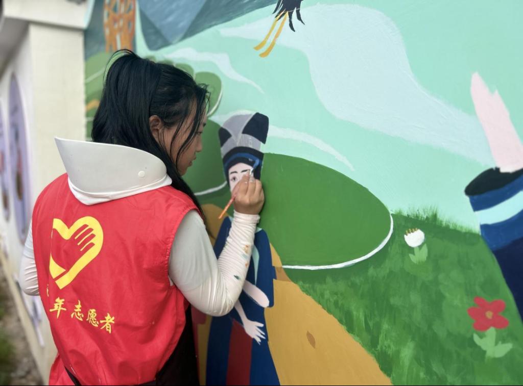 志愿者给墙体上色