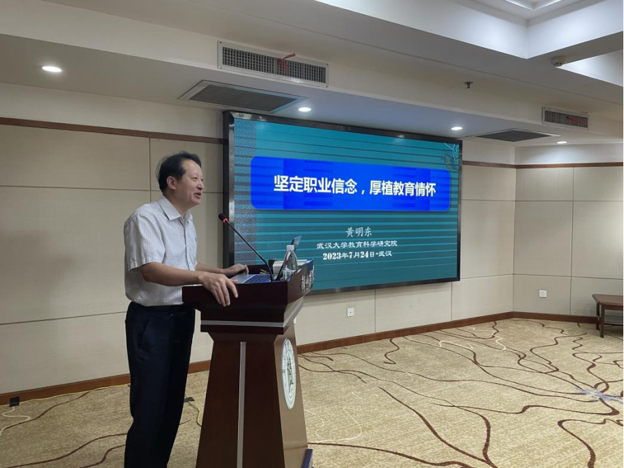 教育部新世纪优秀人才支持计划入选者、武汉大学教育科学研究院博士生导师黄明东教授以“坚定职业信念,厚植教育情怀”为题为新进教职工作专题报告。黄教授结合亲身经历深入介绍了职业定位与职业信念对于教育事业的关键作用,强调了教育情怀对学生成长的积极影响,鼓励教师们不断学习,加强对学生的关爱和理解,努力成为学生成长路上的引路人。