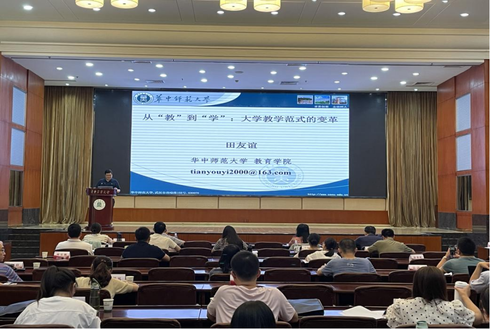 华中师范大学博士生导师,美国马兰里大学访问学者田友谊教授作题为“从‘教’到‘学’,大学教学范式的改革”的专题报告。田教授深入剖析了传统大学课堂教学模式面临的挑战,重点介绍了以“学”为中心的教学方法。他表示,随着时代的发展和社会需求的不断变化,大学教师应不断学习与创新,以培养出适应未来挑战的人才。