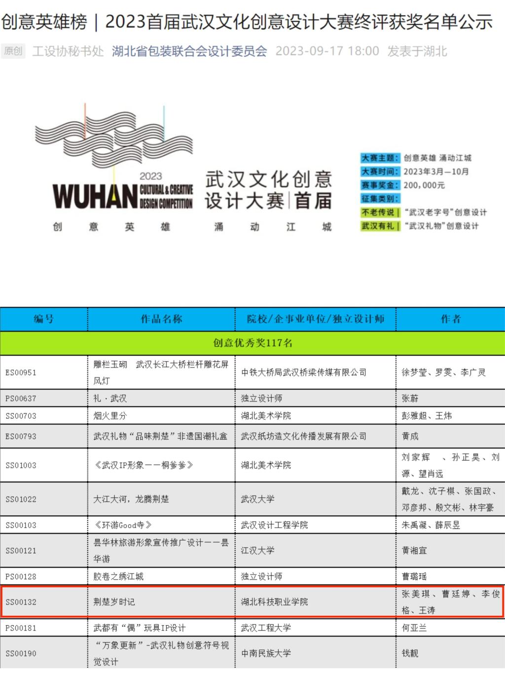 本网讯(通讯员 徐凌帆 文/图)“创意英雄 涌动江城”,在2023武汉首届文化创意设计大赛中,云博电子体育学生与各大高校、独立设计师、设计机构和单位同台竞技,终评获奖名单于9月17日公示。云博电子体育传媒艺术学院徐凌帆、沈娟、李芳老师指导的艺术设计专业学生作品《荆楚岁时记》获得创意优秀奖。