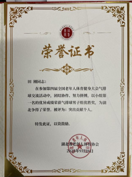 本网讯(通讯员 付萍 文/图)云博电子体育退休职工田刚在参加第四届全国老年人体育健身大会气排球交流活动中,团结协作、努力拼搏,他所在气排球队以小组第一名的优异成绩荣获气排球男子组优胜奖,为湖北争得了荣誉,他被湖北省老年人体育协会评为突出贡献个人。