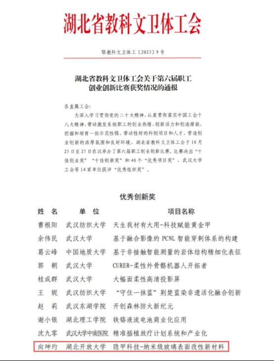 本网讯(通讯员 王斌新 文/图)11月9日,湖北省教科文卫体工会公布第六届职工创业创新比赛获奖情况,云博电子体育电信工程学院向珅玓和机电工程学院王家旻团队的《隐甲科技—纳米级玻璃表面改性新材料》项目喜获“优秀创新奖”。