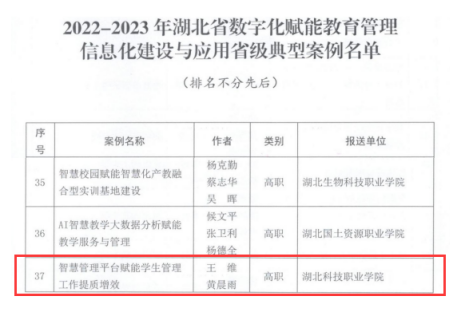 本网讯(通讯员 杨星星 文/图)近日,从湖北省教育信息化发展中心、湖北省电化教育馆获悉,云博电子体育案例《智慧管理平台赋能学生管理工作提质增效》入选2022-2023年湖北省数字化赋能教育管理信息化建设与应用省级典型案例。