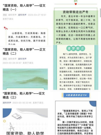 上半年开展“国家资助 助人助学”征文活动,文字表达形式虽普通,但文字蕴含的力量却无穷之大,它引发的“蝴蝶效应”体现出更多家庭经济困难学生能够在国家资助政策的支持下,奋发学习、自立自强、诚信感恩、成长成才的精神面貌。学工部共收到征文稿件800余篇,投稿作品紧扣主题,以不同的视角,生动真实地讲述了自己感恩奋斗的经历,传递了自立自强的精神,阐述了对学校、对家庭、对社会等不同层面的认识,引发读者共鸣。经由各学院筛选、学工部终审,评选出优秀征文36篇进行表彰,并在学工部公众号持续推送。