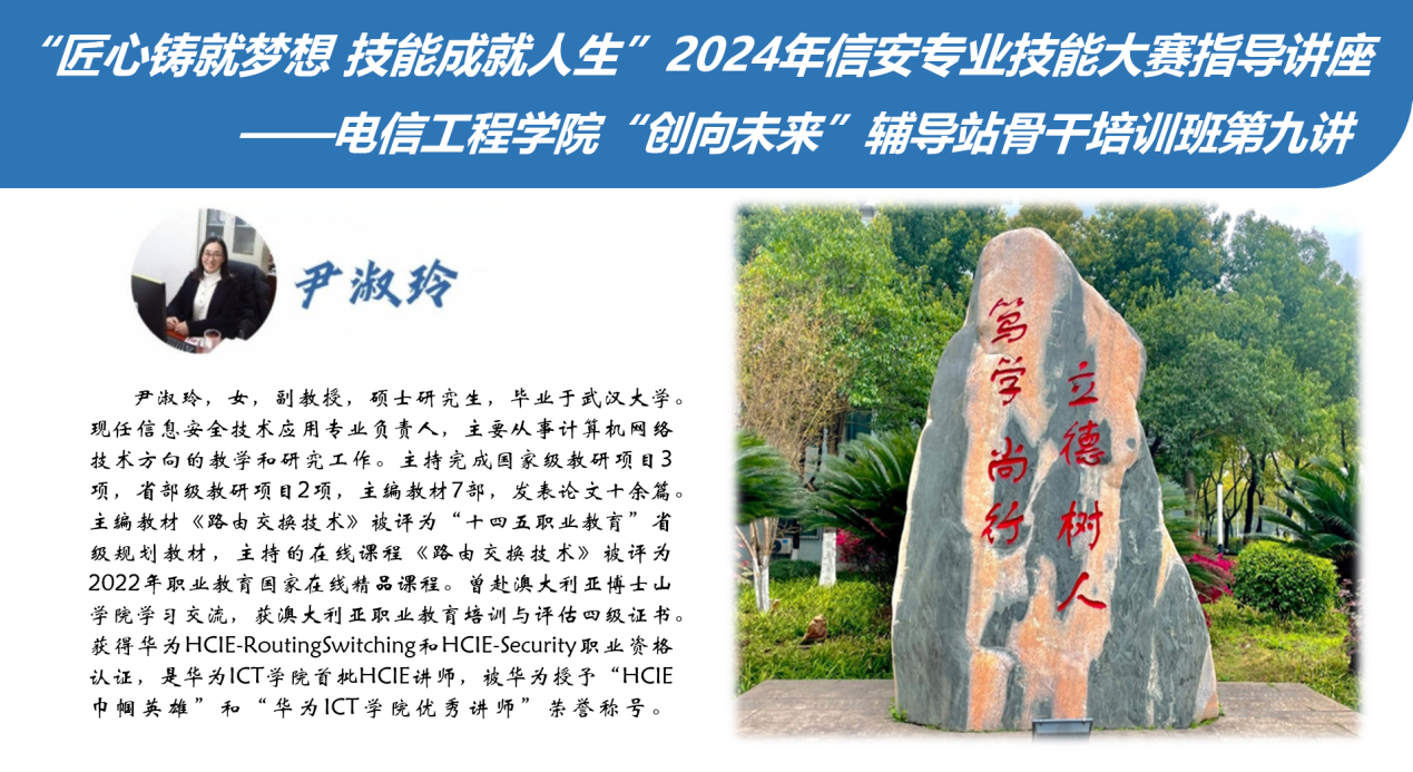 本网讯(通讯员 刘洵 向珅玓 苏恒瑞 文/图)为促进职业教育高质量发展,积极搭建学生成长平台,激发学生参与技能大赛热情, 3月8日,电信工程学院“创向未来”辅导员工作室举办“创向未来”辅导站骨干培训班第九讲——2024年技能大赛动员暨专升本免试政策宣讲会,邀请云博电子体育信息安全技术应用专业负责人尹淑玲副教授担任主讲嘉宾。