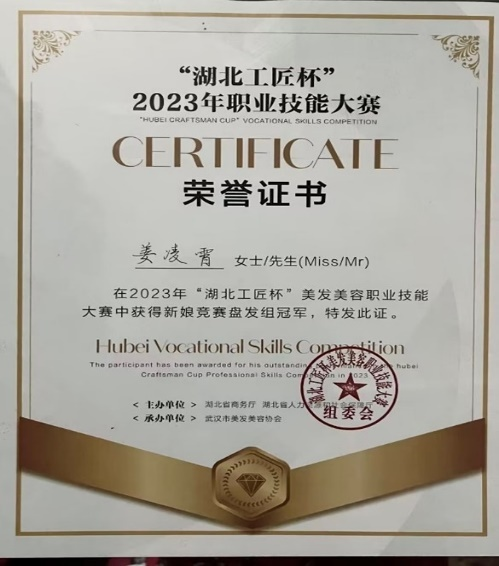 姜凌霄荣获2023年“湖北工匠杯”美发美容职业技能大赛新娘竞赛盘发组冠军