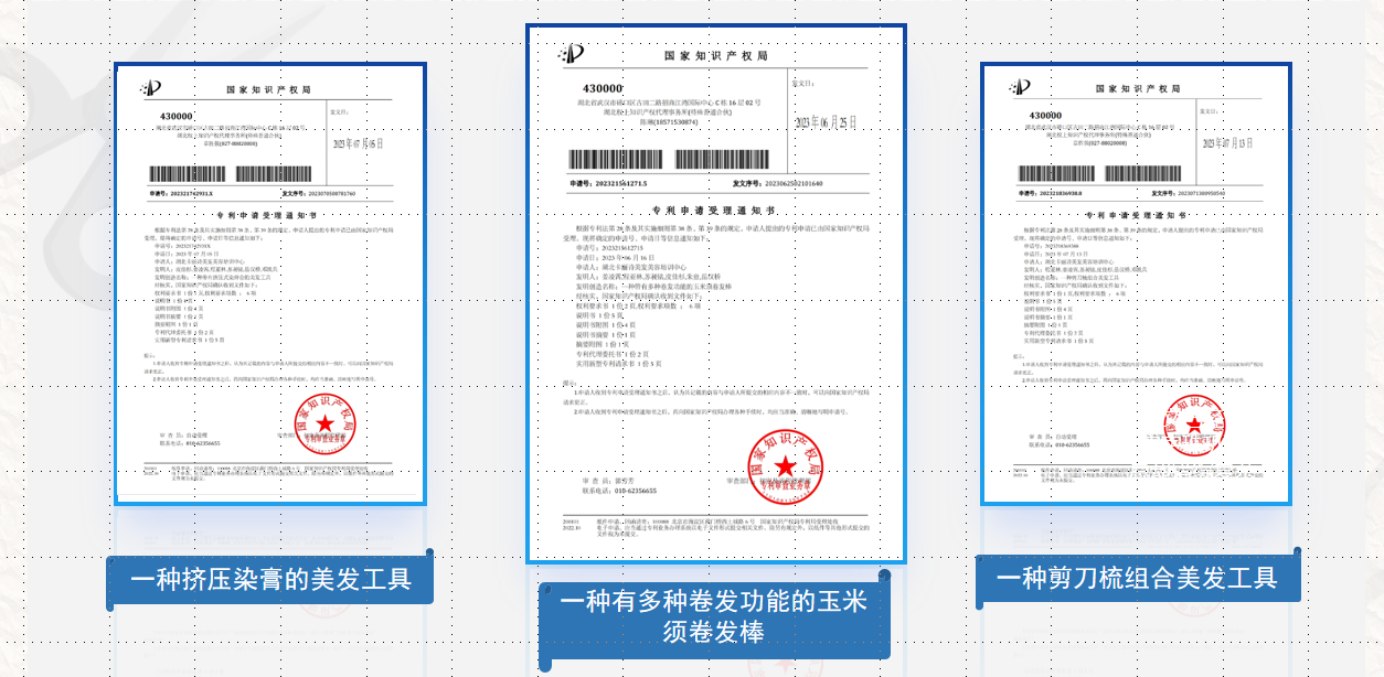 “纸上得来终觉浅,绝知此事要躬行”。从书本上得来的知识,毕竟不够直观。他抓住每一次专业技能实践的机会,全神贯注,把各项操作要点和老师的指导铭记于心,专业技能迅速提升,并结合专业所学,申请通过了3项专利:一种挤压染膏的美发工具,一种有多种卷发功能的玉米须卷发棒和一种剪刀梳组合美发工具。