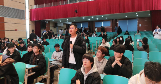 在问答环节,李超凡通过回答同学们热切关心的问题,如“如果遇到诈骗,我们第一时间应该怎么做比较有效”“网上遭到辱骂,作为学生该怎么处理”“为什么年轻人更容易被电信诈骗”等,深入浅出,化繁为简,从法律的层面为同学们指明了方向。