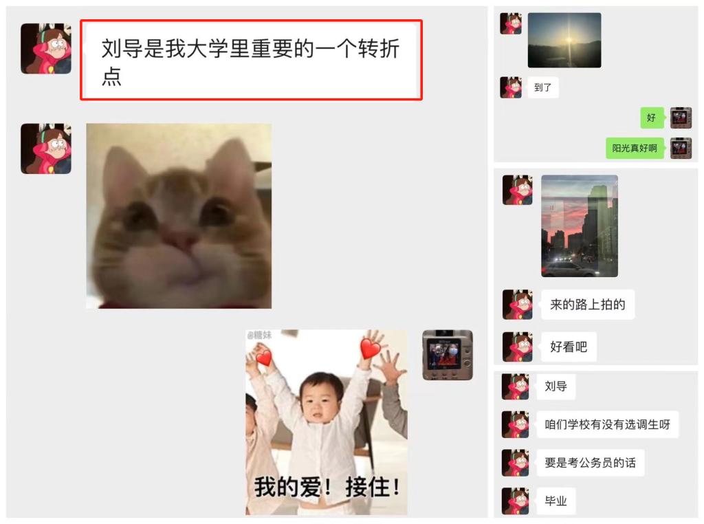 慢慢地,我们的聊天记录也由我的一句又一句主动发言变成了“刘导,今天的阳光真好呀。”“刘导,我拍到了粉红色的天空。”“刘导,我可以考公务员吗?”“刘导,我想考专升本,你能给我一点建议吗?”“刘导是我大学里重要的一个转折点。”