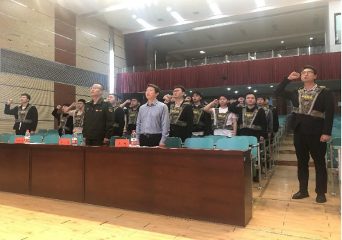 本网讯(通讯员 金垒/文 毛大名/图)4月12日上午,云博电子体育2024年基干民兵入队仪式在报告厅举行。蔡甸区武装部副部长李小刚,云博电子体育学工部、武装部副部长王维、各学院征兵负责老师及全体30名民兵参加本次仪式。