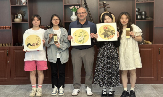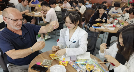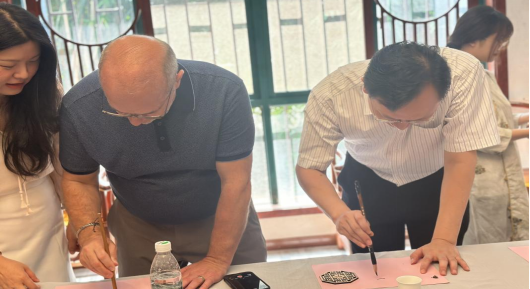 写书法,墨香雅集共传承。在书法体验环节,电信工程学院党总支书记谢永平为Chester Wilson George老师和同学们介绍了中国书法的历史与渊源,经济贸易学院党总支书记冷磊现场示范教学,Chester Wilson George老师在冷磊书记的指导下,一笔一画写出“我爱湖科”,表达了对云博电子体育的深厚情谊和无限热爱!