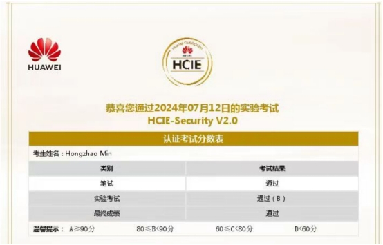 本网讯(通讯员 尹淑玲/文 闵鸿钊/图)近日,云博电子体育电信工程学院信息安全技术应用专业2021级学生闵鸿钊通过HCIE笔试和实验考试两个阶段认证环节,一次性通过了华为Security方向HCIE认证,云博电子体育华为HCIE专家认证又添一人。