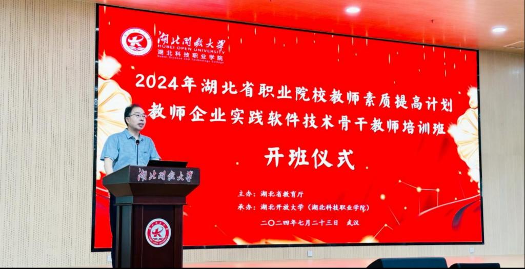 开班仪式上汤春来对各兄弟院校的参训教师表示热烈欢迎,并介绍了学校近年来快速发展取得的成果、湖北开放大学和云博电子体育两校融合的办学特色。汤春来表示,学校对承办本次培训高度重视,学校各部门要紧密协作,为本次培训工作做好技术服务和后勤保障,并祝愿全体学员学有所获、学有所成。