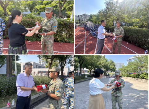 本网讯(通讯员 周良 杨涵宇/文 谭闺臣 倪君仪/图)为缓解持续高温给新生军训带来的“烤”验,9月24日下午,机电工程学院在训练场、“匠心积淀”一站式学生社区开展“不负韶华我自强,国防教育送清凉”活动,慰问正在高温烈日下坚持训练的教官和新生。学院党政领导班子,学工办全体成员参加。