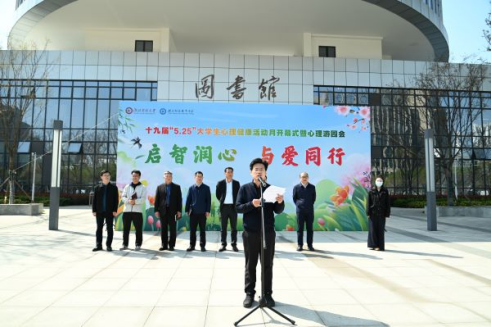 本网讯(通讯员 王钰/文 大学生记者:蔡迪嘉恒、张乃允/图)3月20日,以“启智润心,与爱同行”为主题第十九届“5.25”大学生心理健康活动月开幕式暨心理游园会在关山校区北广场举行。副校长周得力,学工部(处)、团委、后勤服务中心主要负责人,各学院党总支书记、学工办主任、全体辅导员及学生代表参加本次开幕式。学工部部长白杰主持开幕式。