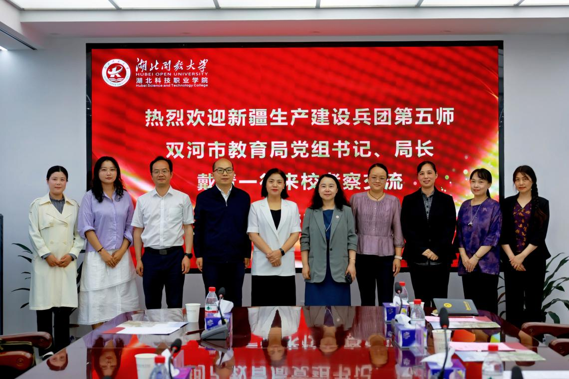 本网讯(通讯员 熊韵坚/文 周夏/图)5月15日下午,新疆生产建设兵团第五师双河市教育局党组书记、局长戴青,双河职业技术学院党委书记樊荣一行来校考察调研。校党委常委肖潇,学工部、教务处、人事处、工商管理学院负责人陪同调研并参加座谈交流。