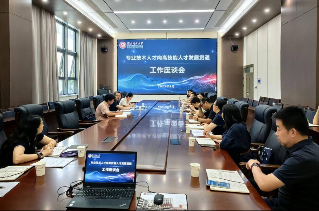 座谈会上,左磊围绕专业技术人才向高技能人才职业发展贯通这一核心政策,进行了全面且深入的解读。他详细阐述了贯通申报的条件与流程,清晰勾勒出两类人才职业发展互通的“桥梁机制”,为参会人员搭建起政策理解的框架。结合当下职业教育改革的趋势,左磊进一步说明了技能大师工作室申报要点、职业技能等级认定条件、新工种申报等关键内容。他鼓励教师们积极依托政策优势,实现职称向技能的转换,借助“以评促学”的方式,全面提升自身的综合职业能力,以更好地适应职业教育发展的新需求。