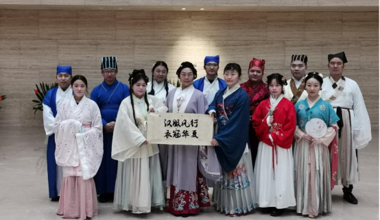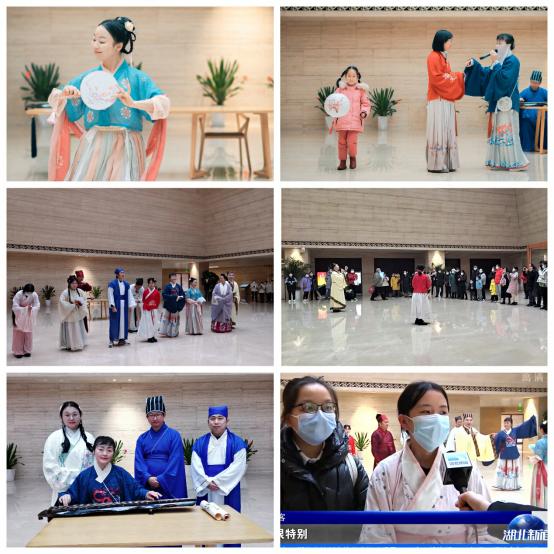 随后,在副院长朱垣的带领下,大家来到博物院序厅参与汉服情景模拟“穿越”活动,闻讯赶来的汉服“同袍”们共同呈现了一场非遗艺术“快闪”表演,吸引许多到馆参观的游客驻足观看。俞运龙老师等人的古琴雅音、昆曲雅乐、古典舞、国学诗词情景剧、汉服集体舞轮番上演,赢得观众掌声阵阵。在最后的集体舞环节,还邀请观众共同参与,大家载歌载舞,共同欢庆元宵佳节,充分体验传统文化的魅力。湖北卫视等媒体现场采访并进行了报道。