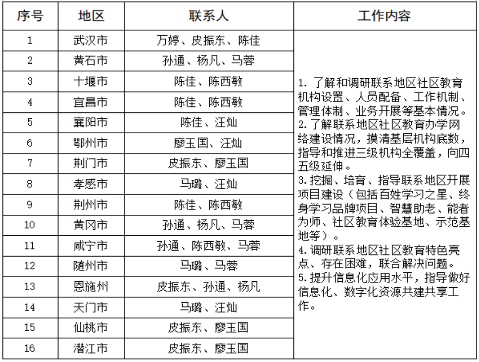 科学谋划下好“先手棋”。在《通知》基础上,学院明细了《湖北省社区教育指导中心指导服务安排表》与《指导服务记载表》,要求全院全员全覆盖对口服务省内各市(州)社区指导中心以及辖区内基层社区教育教学点,强调密切联系基层、提高履职本领、强化责任担当,以月为单位推进工作,定期公示指导进展,以成效为导向考核工作绩效。